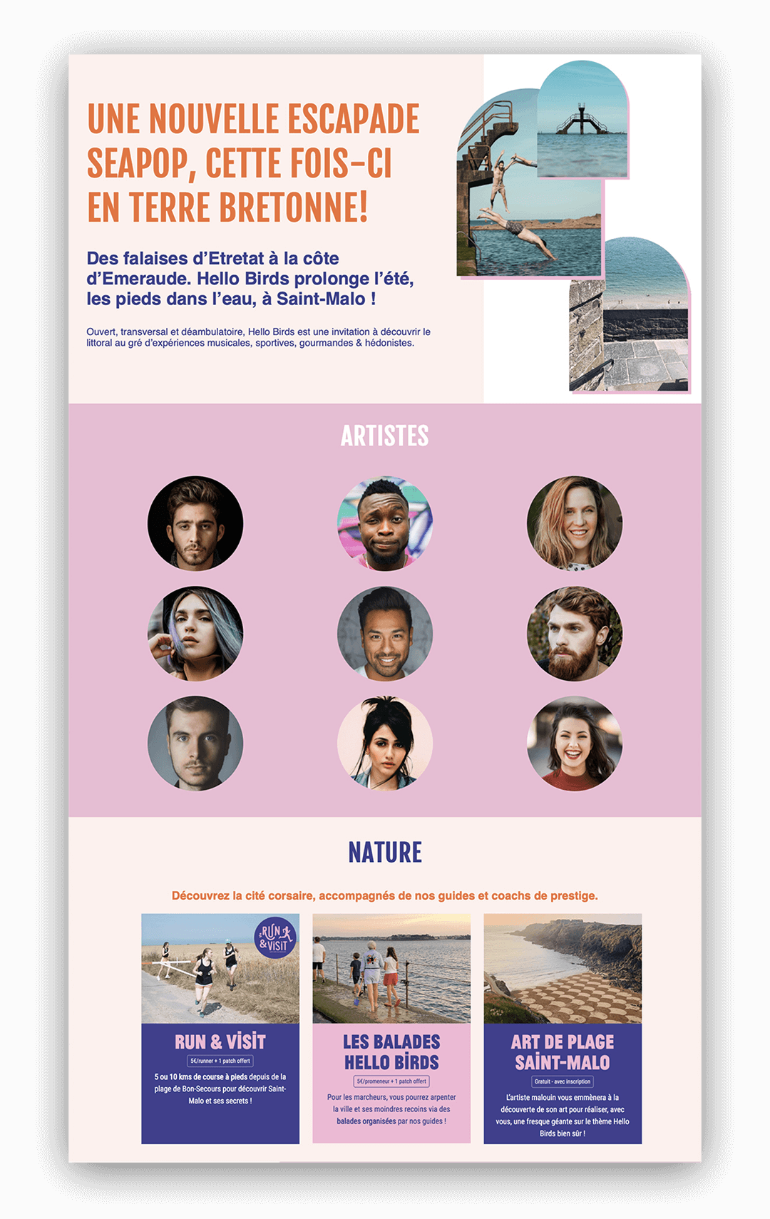 Ouvert, transversal et déambulatoire, Hello Birds est une invitation à découvrir le littoral au gré d’expériences musicales, sportives, gourmandes & hédonistes. Projet de licence ayant abouti au développement d'un site pour un festival existant en reprenant l'identité visuelle déjà mise en place.Aperçu